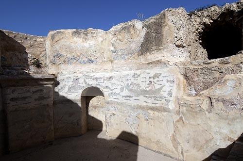 Mosaïque des pêcheurs dans un bassin des Petits thermes publics sur le ssite archéologique romain de Uthina / Oudna dans la région de Mornag banlieue sud de Tunis