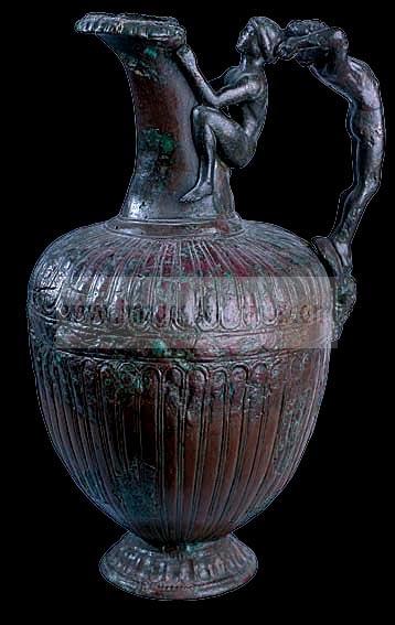 la panse de cette oenochoé (cruche àverser le vin) en bronze est ornée d'un décor simple: des cannelures de part et d'autre d'une bande médiane. L'anse est formée de deux figurines: un adolescent accroché au col qu'il tient entre ses jambes et un personnage barbu dont le corps arqué en arrière prend appui sur un masque servant d'attache inférieure et qui place ses mains sur la tête de l'adolescent. certains spécialistes attribuent cette oenochoé àl'Etrurie