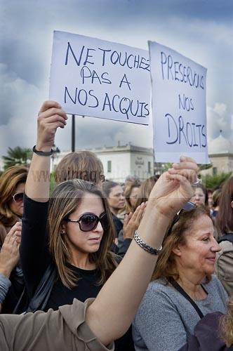 une manifestation pour «la préservation des acquis de la femme tunisienne» dans la nouvelle constitution dont l'élaboration est confiée àl'assemblée nationale constituante qui vient d'être élue le 23 octobre dernier. Les manifestantes qui s'affirment «indépendantes» ont brandi des pancartes avec des inscriptions sur lesquelles était écrit: "une constitution garante des droits de la femme tunisienne"