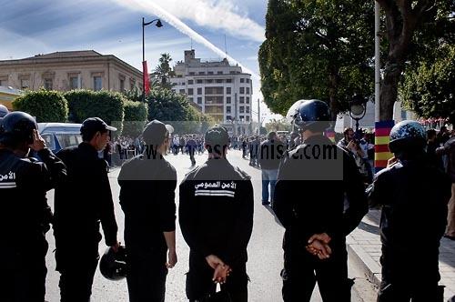 un petit groupe de manifestants s'est rassemblé àl'appel des députés de l'oppostion de l'ANC sur le haut de l'avenue Habib Bourguiba. La police marquera une présence nombreuse bloquant l'évolution des quelques 300 manifestants pacifiques désireux se rendre au Ministère de l'Intérieur. Le face face fut tendu mais pacifique. Pendant ce temps une réunion au Ministère de l'Intérieur se tenait avec les députés de l'opposition venus demander des explications et des sanctions pour les actes survenus la veille de la part de la police et d'une éventuelle milice nadhaouiste.