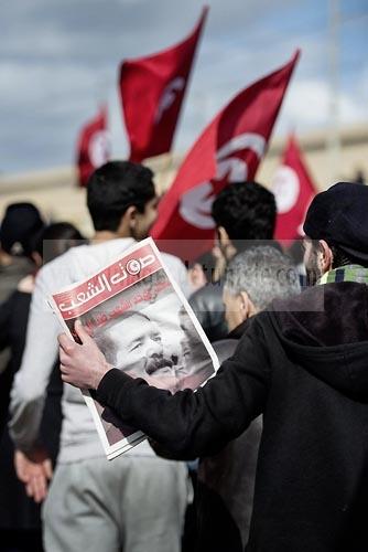08 février 2013 : le cortége funéraire se rend au cimetière. Enterrement de Chokri Belaid àTunis. Une foule de près de 40 000 personnes accompagnent le corps de Chokri Belaid au cimetière après son assassinat deux jours auparavant. La Tunisie en hommage àl'un des grands leaders de l'opposition et pour contester la violence politique respect une grève générale nationale.