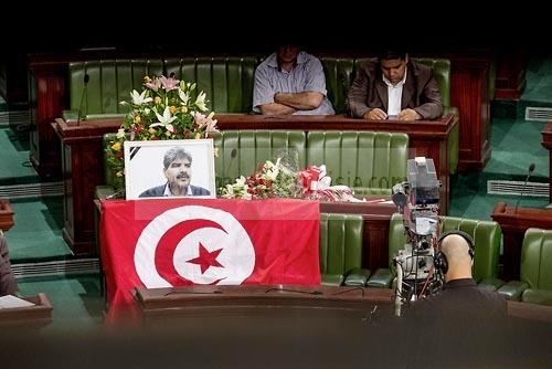 son portrait et un drapeau national àla première séance de l'Assemblée depuis l'assassinat du député Mohamed Brahmi. La séance plénière débute par un long hommage au martyr avec prières et discours en présence des députés