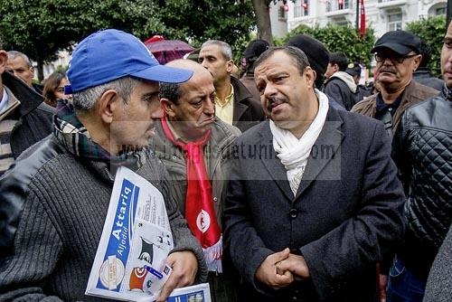 14 janvier 2014 : Samir Taieb arpès de ses militant ssur le stand d'Al Massar sur l'avenue Habib Bourguiba àTunis quelques milliers de tunisiens sont venus se rassembler pour commémorer le troisième anniversaire du départ de l'ancien Président Ben Ali