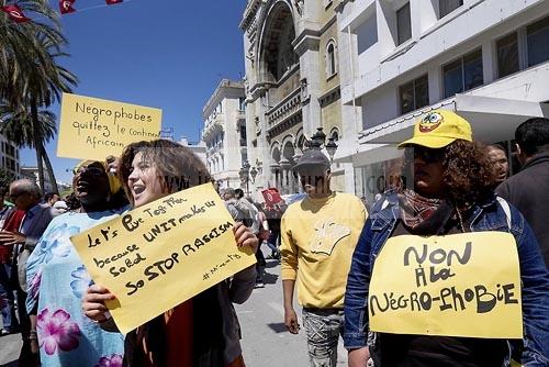 1er mai 2014 : Groupe de noirs tunisiens protestant contre le rascisme. Manifestations de l'UGGT et de l'extrême gauche pour commémorer la Fête du Travail àTunis