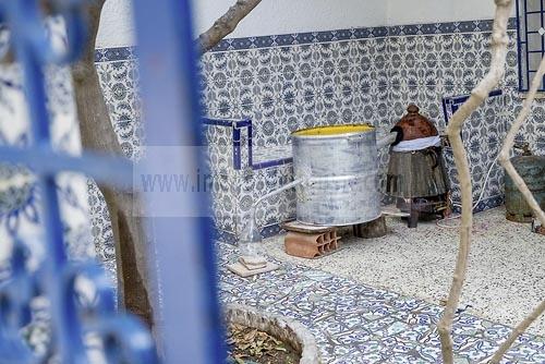 Distillation traditionnelle de fleurs de rose dans maison de la région de Nabeul au Cap Bon. L'eau et l'essence de rose provient de la distillation des fleurs de rose. La distillation est conduite très doucement sur le feu