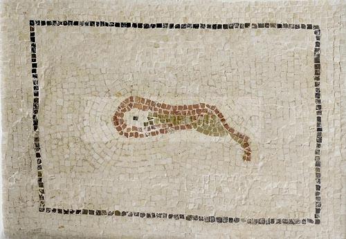 Mosaique d'un xenion (cadeau d'hospitalité) un cuissot de lièvre. C'était la partie la plus appréciée en cuisine. musée archéologique de Sousse dans la Kasbah située en haut de la medina de Sousse