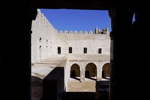 La cour intérieure entourée d'un portique sous lequel s'ouvrent les cellules des moines du ribat de Sousse. Sousse ou la perle du Sahel.